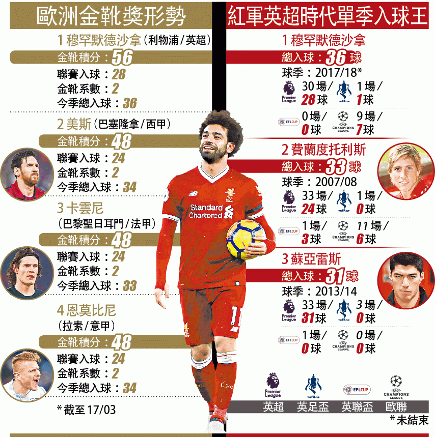 另外,個人已累積36球的沙拿,也超越了費蘭度托利斯在2007/08球季時創下的33球紀錄,成紅軍在英超時代單季各項賽事的總入球王;同時這位首位在英超單場射入三球或以上的埃及球員,也是歷來在地標球季為紅軍入球最多的球員,而球季還有兩個月才完結,相信這項數據仍會不斷刷新。