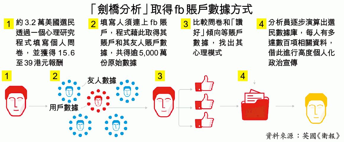英國《衞報》和美國《紐約時報》前日披露,「劍橋分析」找來劍橋大學任教心理學的俄羅斯裔美國教授科根(Aleksandr Kogan),設立了一個掩飾成與心理研究相關的應用程式,2014年6月起付小量金錢讓用家填寫個人問卷調查,要求他們同意讓資料用作學術研究,並連接fb賬戶。