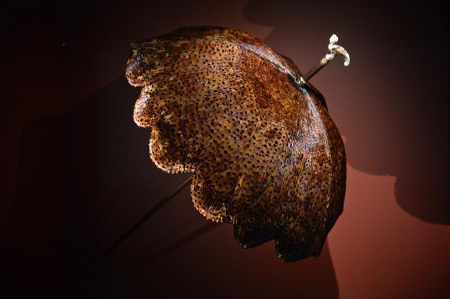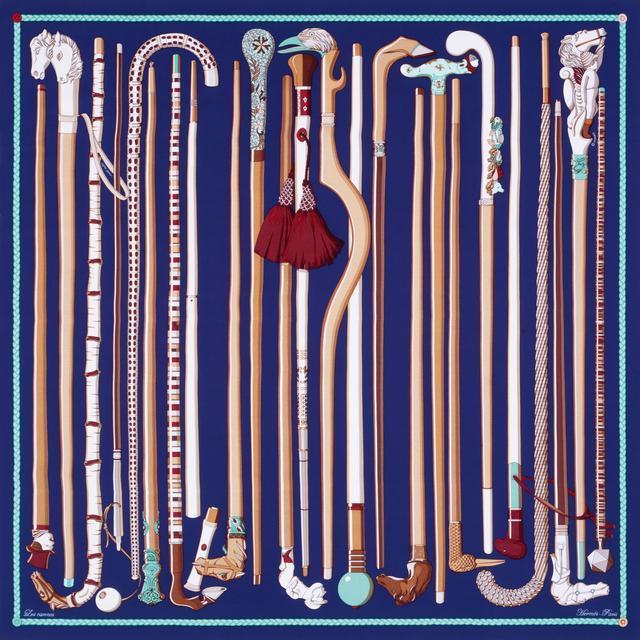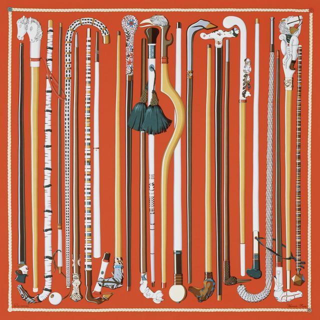 2012年秋冬季推出的「創意拐杖」,受到愛馬仕家族第三代Émile Hermès激發靈感,他12歲時在古董枴杖裏發現暗藏的絲綢小陽傘,意外驚喜開啟他的收藏之路,圖中共有24把枴杖,許多都跟馬術世界有關。精緻的馬頭枴杖頭,伴隨宛如小孩身形的騎師,巧妙布局在絲巾各處。