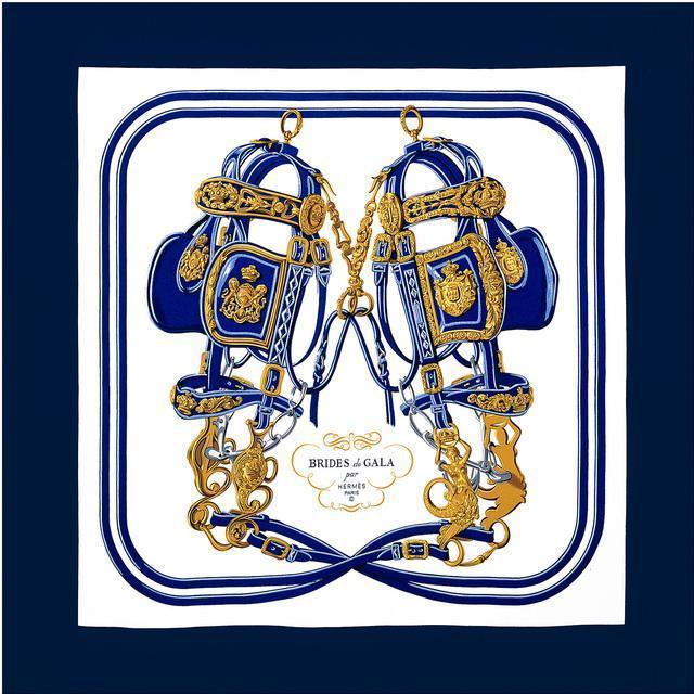 1957年登場的「華麗韁轡」,細膩描繪馬具中的轡頭與韁繩,構圖嚴謹、左右對稱,筆法細膩又華麗奪目,名列愛馬仕十大最受歡迎暢銷絲巾之一。