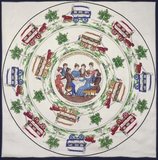 「女王與馬車」在1937年面世,生動記錄當時社交場景,上流名媛們圍坐長桌玩牌類遊戲,圍繞着她們的內圈是順時針行駛的橙色馬車,外圈則是逆時針行駛的藍色馬車,畫面宛如旋轉圓盤,饒富動感,是愛馬仕史上第一款絲巾,由愛馬仕第四代傳人兼總裁Robert Dumas設計。