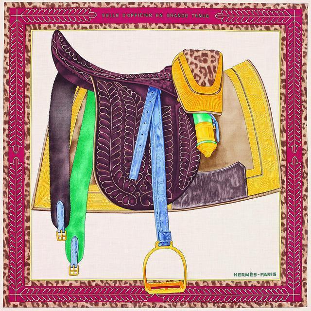 2017年秋冬推出的「盛裝軍官的馬鞍」,絲巾上的馬鞍是將軍專用,由製造軍用裝備著稱的巴黎Bidal et Piat工作坊製作,在1884年到第一次世界大戰初期被法軍採用。馬鞍飾以摩洛哥皮革和絲絨,點綴了細膩的葉片飾紋,鞍上配飾當時被稱為「虎皮」的豹皮、飾帶,以及精雕細鏤的銅飾。