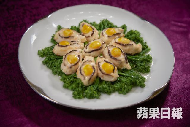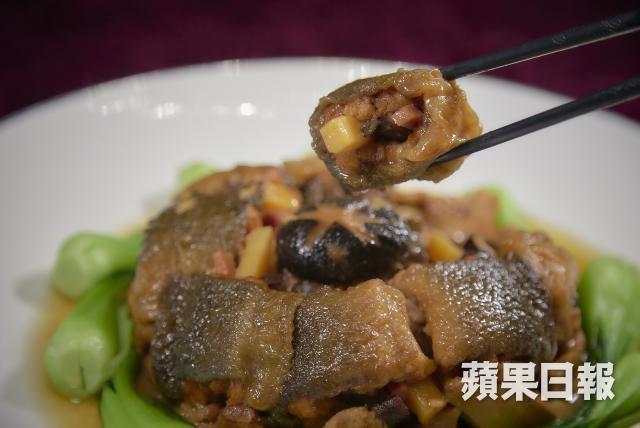 董師傅將湯放到蒸爐後對我說:「台菜應該跟中國菜沒甚麼差別,先民是從廣東、福建那邊來的,中藥材也都是一樣,所以你說有差嗎?沒有差別吧。」但Liz就覺得這個湯頭,比起粵菜的老火湯要清淡得多,「它的湯比想像中清淡,卻又有濃郁的藥材味道,以及高湯本身的鮮味,再加上雞肉、豬肚、鱉肉的精華,是一道很補的湯。」Liz說。從湯品看來,的確跟粵菜有點相似,所以董師傅立即做了另一道菜:翠玉通心鰻。「以前可能會有人說 台灣沒有精緻的大菜,其實不是,台菜裏面還是有強調手工的菜。」例如這道通心鰻,做法就非常講究,先將鰻魚炸過再蒸,然後把骨頭除掉,中間再塞香菇、筍絲、金腿絲等餡料,最後與炸過的豬腩排、綠竹筍依次鋪在碗中蒸煮,整盤倒扣上碟。去骨鰻魚果然肉質鮮嫰,充滿膠質,而配菜的黑菇以黑龍醬油等調味後煨煮,亦非常入味。