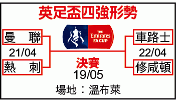 而曼聯嘅唯一爭標希望英足盃,禮拜日亦都有四強抽籤,曼聯就會對熱刺,呢場波喺溫布萊踢,變相曼聯就係作客。