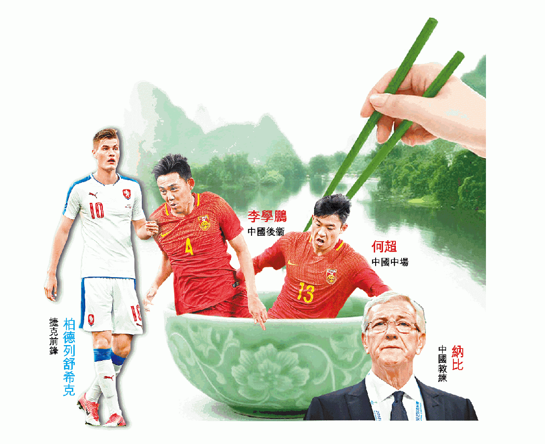中國上周四在中國盃四強遭威爾斯蹂躪六蛋兼丟架,老帥納比承認排陣及點兵失當,國足周一季軍戰在廣西主場面對捷克,勢大換血兼重用世盃外的穩守突擊戰術,那邊廂捷克鋒力亦疲弱,只靠羅馬後備前鋒柏德列舒希克攻堅,就算取勝亦難多取入球,今仗敲入球「細」。