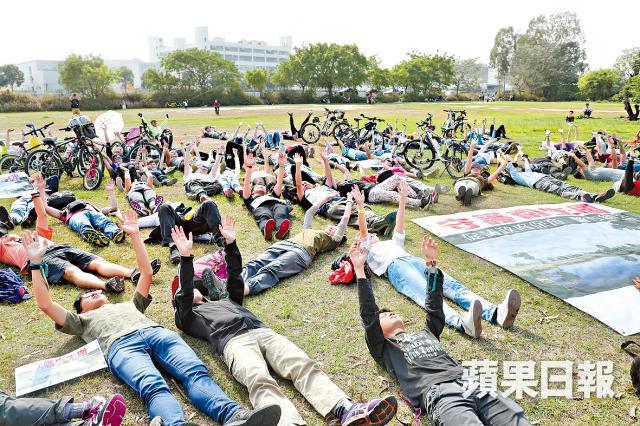 鄺俊宇昨日下午聯同元朗區議員黃偉賢、杜嘉倫,以及百多名市民,於南生圍的大草地舉行集會。他們舉着「守護南生圍,促請政府保育、警方緝兇」的大海報,又向天舉起雙掌,意指不可以讓南生圍淪陷。