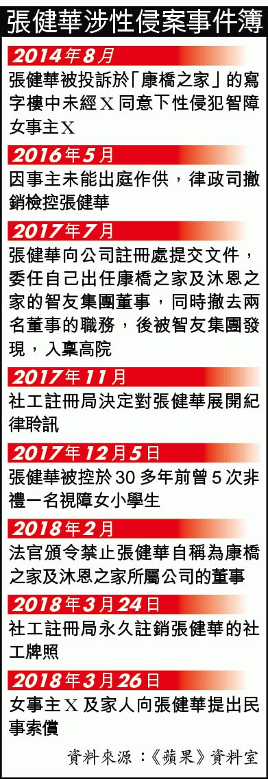 張健華前年被控於2014年8月涉與事主X非法性交,雖有涉案片段和染有張的精液及女方DNA的紙巾等證物,惟事主X因創傷後壓力症及智障無法出庭作供,最終律政司撤銷控罪,張一度申請討回訟費,惟被法官拒絕,指控方無奈撤控「可說是被告的幸運,受害人或社會的不幸」。社工註冊局其後裁決張性侵院友失當違紀將其除牌。