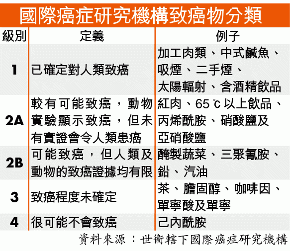 【本報訊】世衞轄下國際癌症研究機構,將致癌或可能致癌的物質分為五級(見表),當中1級代表已確認致癌,例如加工肉、香煙和太陽輻射等。至於咖啡烘焙過程中產生的丙烯酰胺,屬次一級的2A級,即可能致癌,同級別另有紅肉及65℃以上的高溫飲料,有可能因高溫飲料灼傷食道增患上食道癌風險。加工肉及紅肉則與大腸癌、胃癌有關。