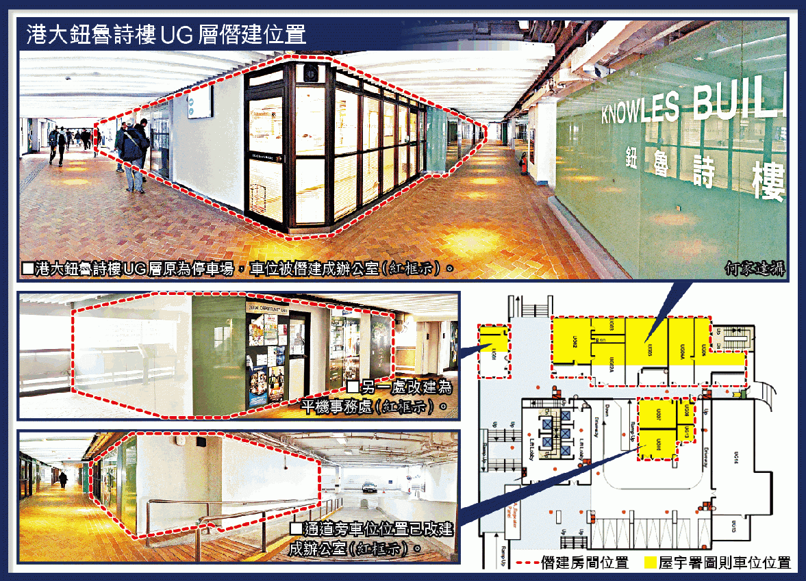 【本報訊】香港最高學府也加入僭建行列,位於香港大學圖書館及梁銶琚大樓之間的鈕魯詩樓UG層原為停車場,現時被改建為多個辦公室,估計樓面面積約6,000呎;屋宇署確認有關工程屬僭建,須予以取締,將向香港大學發出清拆令。有港大老臣子表示,有關工程「起碼廿年」;港大回應指,已委聘認可人士檢視有關樓層,有必要時會改動,但未有回應於何時改建。
