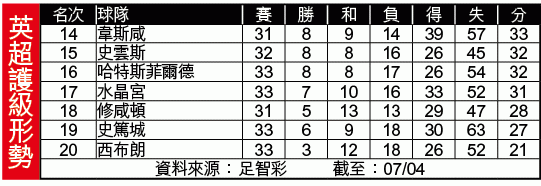 上周六英超不單有曼市打吡,更有多場中下游護級戰。要數最開心的,當然是賓尼迪斯帶領的紐卡素,喜鵲憑舒維爾及艾約斯佩雷斯各入一球,作客2:1險勝李斯特城,累積38分上岸在望,反而包尾的西布朗及史篤城繼續沉淪。