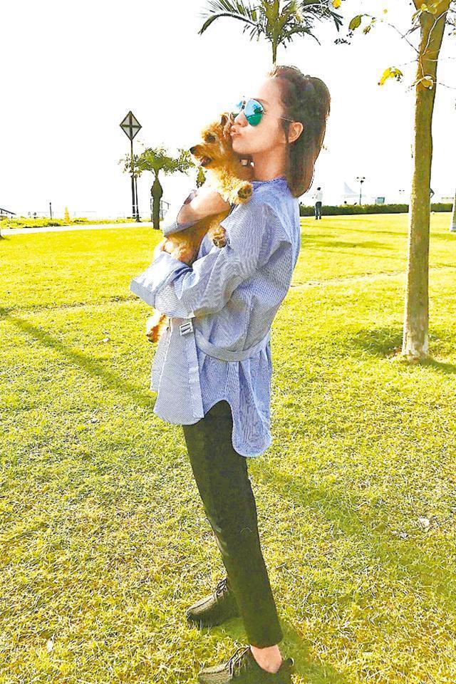 楊愛瑾前年11月宣佈陀B,在社交網貼出跟愛犬到數碼港草地曬太陽的相片,抱起狗仔的她一臉幸福。