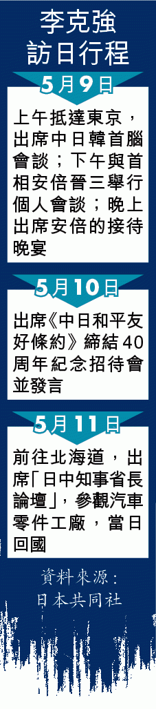 今年是《中日和平友好條約》締結40周年,中日關係有望突破性的改善。日媒昨報道,中國國務院總理李克強訪問日本行程大致敲定在5月9日至11日,除了在東京出席中日韓首腦會談外,還將在《中日和平友好條約》締結40周年的紀念活動上演講,並可能獲安排會見日本天皇明仁。