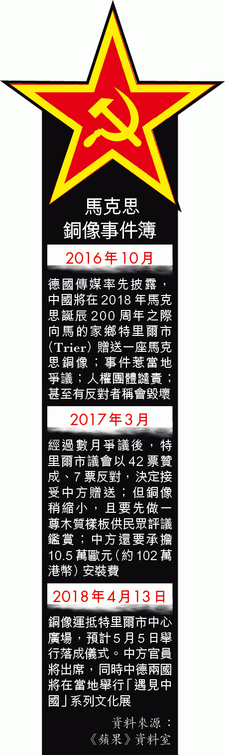 中共為紀念共產主義始創人卡爾.馬克思(Karl Marx)誕生200周年,送給他故鄉的巨型銅像,已運抵德國特里爾市(Trier),下月5日將舉行揭幕儀式。在世界共產主義遭普遍揚棄、只有中國等少數幾國繼續奉行之際,中方此舉曾引國際輿論反對,但當地市議會仍接受捐贈。學者指,中共把自己拋棄了的偶像當禮物送還德國,實為虛偽。