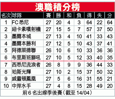 尾場珀斯光輝主場2:3不敵布里斯班獅吼,輸波嘅珀斯光輝宣告無緣躋身季後賽。