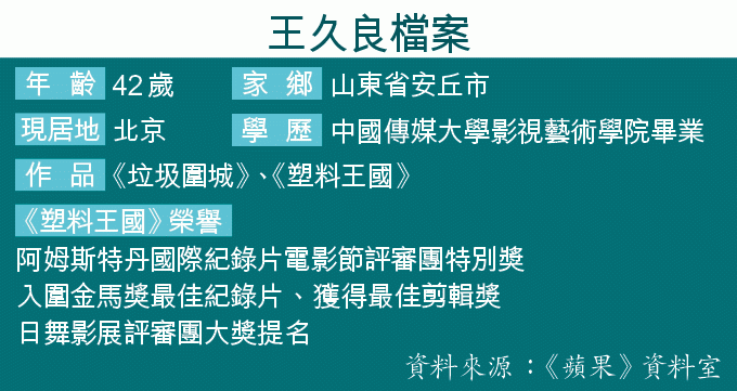 王久良首部作品《垃圾圍城》聚焦北京城外圍的垃圾場,第二部作品《塑料王國》則將鏡頭對準外來的洋垃圾如何影響中國環境問題,在王眼中,無論是本土抑或洋垃圾,透過跨國流動的貿易鏈,其實沒有人是局外人。花了6年時間,跑到美國及日本再回到中國,結合大量調查研究和訪談,終製成兩個版本的《塑料王國》,一個是講述山東小農村以塑料回收維生的兩個家庭所組成的電影版,一個是揭露全球廢塑料問題的26分鐘媒體版。