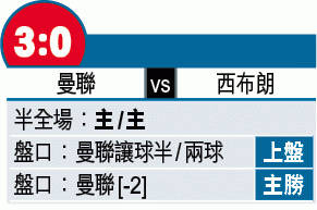 「紅魔鬼」曼聯挾上仗反勝榜首曼城3:2的氣勢,在周日英超迎戰包尾的西布朗時,料可以再勝一仗。由於西布朗態弱兼未能「夫添」,就算曼聯要讓球半/兩球,仍然不嫌多,宜捧紅魔上盤。