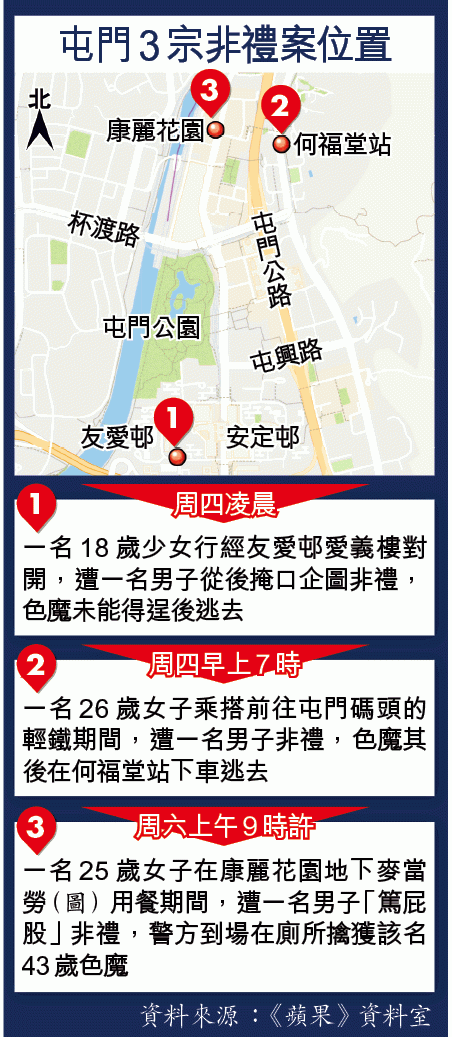 【本報訊】屯門3日內接連發生3宗非禮案,當中一名妙齡女子昨早在一間麥當勞用餐期間,遭一名中年男子用手指「篤一篤」臀部並佯稱問路,女事主立即報案,警員接報到場發現疑人一度匿入廁所暫避,最終待他現身時截查拘捕。另外兩宗較早前發生的非禮案,分別於輕鐵車廂及屋邨公眾地方,令人關注區內治安問題。警方正調查涉案疑犯是否與之前兩宗案件有關。