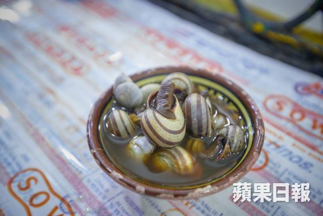 摩洛哥曾是法國殖民地,當地人和法國人一樣愛吃蝸牛,但這裏蝸牛不是矜貴食材,也不如法國蝸牛一般用焗,而是一鑊熟,用多種香料和草藥熬製成湯。蝸牛湯非常普及,一碗盛惠5迪拉姆(約4港元),是平價的平民小食,當地人相信有助消化。來到攤檔,首先問清楚蝸牛從何來,老闆從容地答:「不就是從山上捉下來嘛」。喝一口,味道鹹得要命,有濃郁的辣粉味道。至於主菜蝸牛,首先用竹籤挑出來,黑黑的一團還看到觸角,確實有點惡心;戰戰兢兢地放進口──其實味道正常,質感像煮得軟腍的蘑菇。