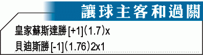 另外,周四亦上演皇家蘇斯達主場迎戰次席的馬德里體育會。皇蘇在B隊教練阿爾古希爾上任教練後,表現止跌回升,今仗面對以歐霸盃為重心的馬體會有望偷雞,「讓球主客和」「主勝」值搏。(球賽編號:星期四6;now632台明日1:30am直播)