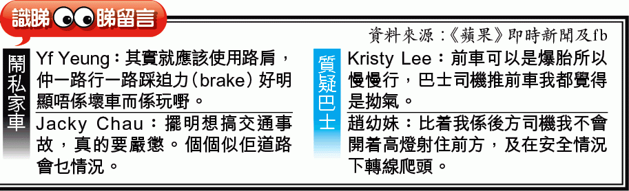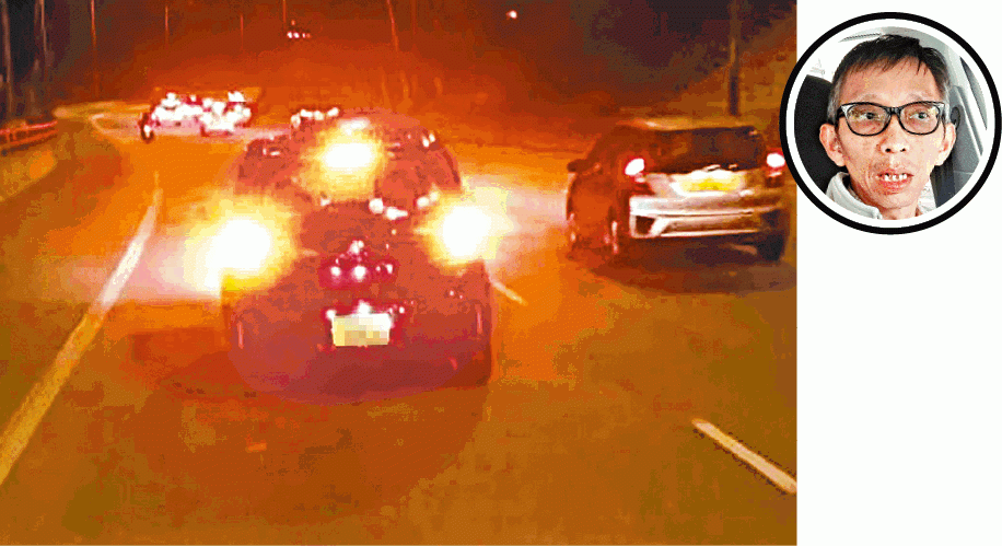 【本報訊】一輛巴士前晚駛經屯門公路期間,前面一輛私家車慢駛並一度打死火燈停車,令巴士要響號急煞,有乘客斥私家車「玩嘢」,對巴士乘客安全構成威脅,事後將拍下的短片放上網公審。《蘋果》聯絡到涉事私家車司機譚先生,他呼冤:「我慢線行70公里有乜嘢錯呢?」澄清是巴士兩度欲爬頭不果,並開高燈射他,他才打死火燈停車示意讓巴士爬頭,但巴士一直尾隨。