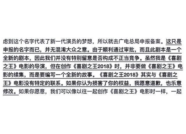 李力持寫道:「我感到非常驚訝和抱歉。可能由於近期我們兩人都太忙了,沒有時間坐下來喝茶聊天,導致產生誤會。《喜劇之王2018》劇本是一個全新的故事,所編寫的故事並沒有抄襲或延續《喜劇之王》電影劇本內容。只是創作的靈感像當年我和周星馳一起創造《喜劇之王》電影的靈感一樣,來自於拍攝時劇組發生的真實勵志趣事改編。」
