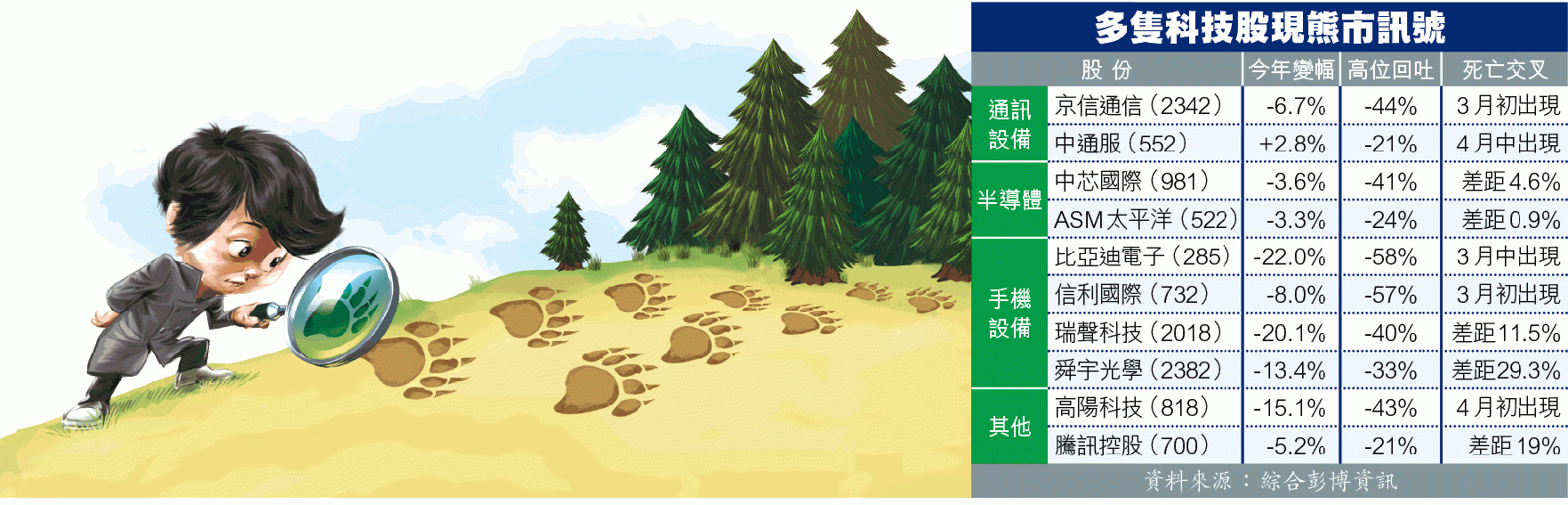 在36隻科技股中,多達75%股份一度由高位累瀉至少兩成,再計入50天線跌穿250天線的「終極死亡交叉」現象,有近半齊集兩大牛轉熊訊號。近月出現死亡交叉的科技股以中小型硬件股為主,如比亞迪電子(285)及信利國際(732),以及電訊設備股如京信通信(2342)及中通服(552)等,市場焦點的騰訊、瑞聲(2018)及舜宇(2382)等大型股份,即使本月分別累瀉5.2%、20.1%及13.4%,但50天線與250天線的差距仍大,介乎一成至三成。