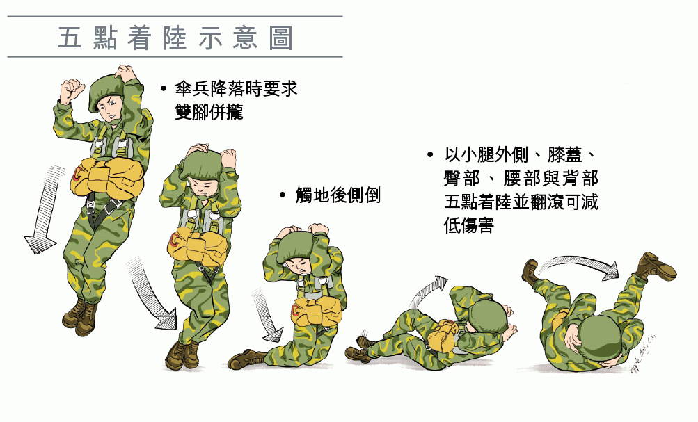 陸軍航空特戰指揮部政戰主任少將武立文對台媒表示,特戰傘兵一項基本訓練,是做「五點着陸」的反射動作,這是緩衝下降速度的保護措施,傘兵必須雙腳併攏,以雙腳接觸地面後側倒,「接着以小腿外側、膝蓋、臀部、腰部與背部」,共五點進行翻滾,避免重擊頭部造成重傷害。根據醫療團隊提供的秦良丰傷害部位來看,「(他)有成功五點着陸」。另有退伍傘兵認為,事發時主、副傘都半開,減少很多墜落阻力,因而救了秦。