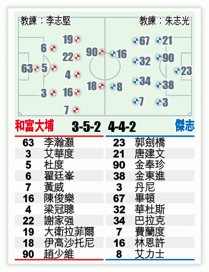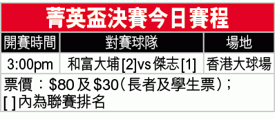 【菁英盃決賽】上屆在決賽反勝香港飛馬的地區球隊和富大埔,今日三時會在香港大球場上演的菁英盃決賽,挾七連勝的強勢迎戰聯賽冠軍傑志,力圖衞冕外,更圖雪今季港超兩敗之恥。