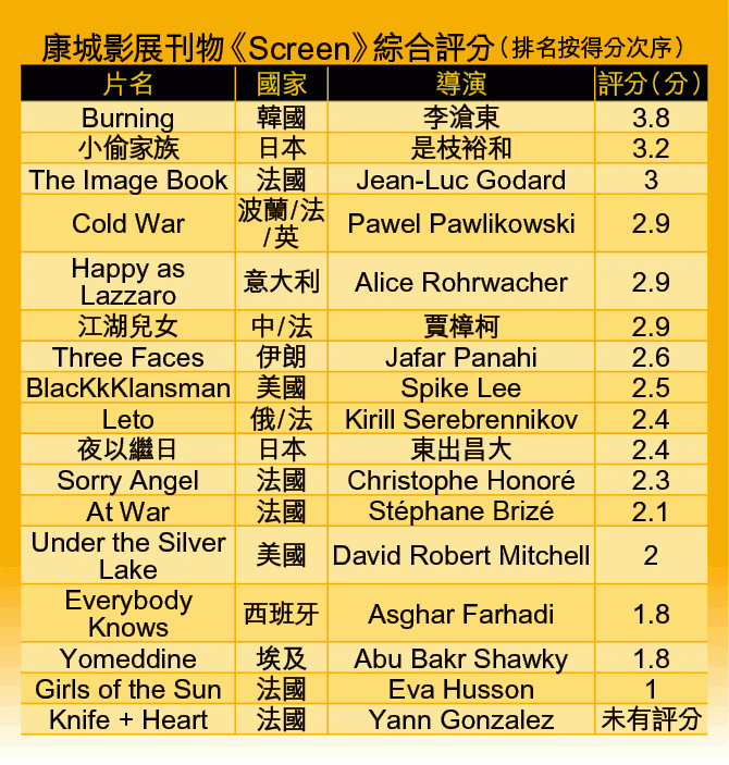 第71屆康城影展於香港時間明日凌晨閉幕,多部競賽片已進行首映,由於今屆有多齣亞洲片的口碑都好好,當中日本名導是枝裕和執導的新作《小偷家族》於日前獲影展官方刊物《Screen》給予3.2高分,原本被看好奪大獎,但隨着韓國名導李滄東執導、劉亞仁主演的韓片《Burning》於當地時間16日舉行首映後,《Burning》的分數高達3.8分,除了更勝《小偷家族》外,更打破前年《爸不得妳快樂》(Toni Erdmann)的3.7分紀錄,暫時成為《Screen》史上最高分數的電影,更被一致推舉有望成為首齣韓片贏金棕櫚大獎。