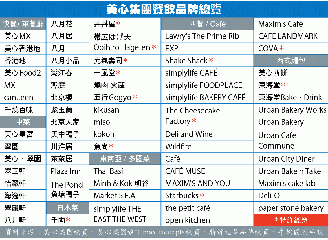 近年港人追捧隱世小店,不過所謂「小店」背後老闆可能是大集團。經本報統計,目前美心旗下餐飲品牌多達約72個,涉獵快餐及茶餐廳、中菜、亞洲菜、西餐及café、西式麵包五大類。