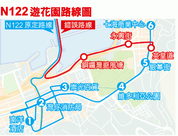 讀者盧先生話佢噚日凌晨零時左右,喺深水埗上咗架N122九巴過海去銅鑼灣,喺九龍區嘅路程一直都相安無事,當巴士一出紅隧就出事喇,「一出隧道已經入錯線。」司機之後沿維園道向北角方向行,「喺避風塘停咗一次,部份乘客發覺佢行錯,已經落車。」據N122原定路線,離開紅隧後第一個站應該係灣仔南洋酒店,再去崇光百貨、維園,經炮台山、北角,終點係筲箕灣。