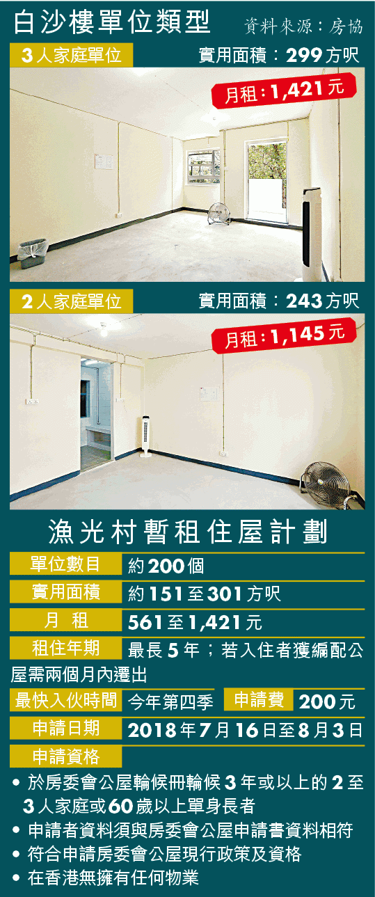 黃續稱合資格人士最快今年第四季入伙,月租介乎561至1,421元,最長可租5年,直至2023年漁光村清拆,若入住期間獲編配公屋,則需於兩個月內遷出。黃稱該批單位空置約3年,房協將斥資約1,000萬元翻新,「換過啲電線、髹過啲油漆」。