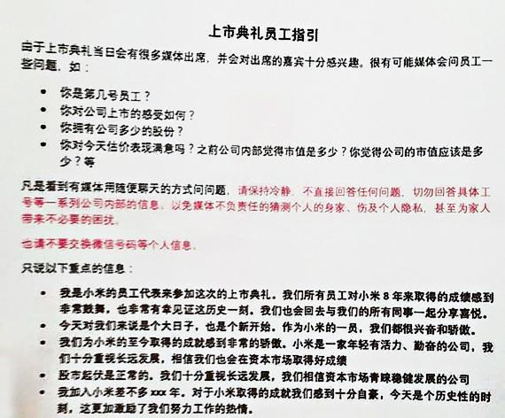 指引更列出「重點信息」,大體上要求員工回答記者問題要帶出對小米上市感到「非常鼓舞」、「非常有幸見證這一刻」。