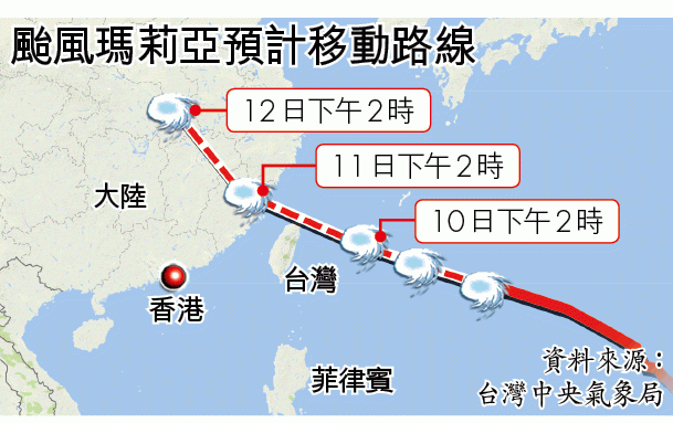 國家災害防救科技中心分析,瑪莉亞致災高風險區域為台北、新北、基隆及宜蘭等9縣市。華航向《蘋果》表示,截自昨午5時,航班未受颱風影響而改動。港航方面,包括10日HX6652(香港往沖繩)、HX6653(沖繩往香港)、HX284(香港往台北)、11日HX285(台北往香港)取消,港航提醒,旅客可登入港航官網查詢。國泰航空宣佈,10日CX408(香港往台北)11日CX463/CX465/CX407/CX403/CX469(台北往香港)取消。颱風登陸或掠過台灣後,預計周三(11日)上午在福建晉江到浙江溫州一帶沿海登陸,屆時浙閩海域將出現4至6米的巨浪,國家海洋預報台專家表示,瑪莉亞強度強、移動速度快,當局已發佈海浪黃色警報。