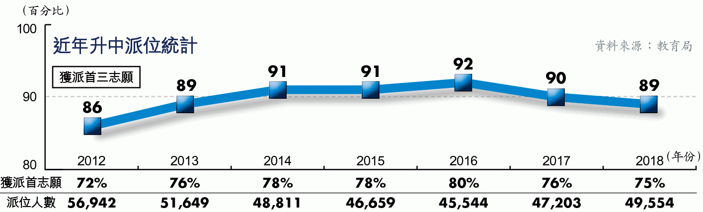 參與升中派位的學生人數在2016年見底,翌年回升,今年度共有49,554名學生參加,自行分配學位及統一派位階段獲派首志願的學生人數合計,整體滿意率為75%,較去年微跌1個百分點,創6年新低。教育局表示,在獲自行分配學位的學生當中,64%學生獲派首志願學校;透過統一派位獲派學位的學生當中,則有59%學生獲派首志願。