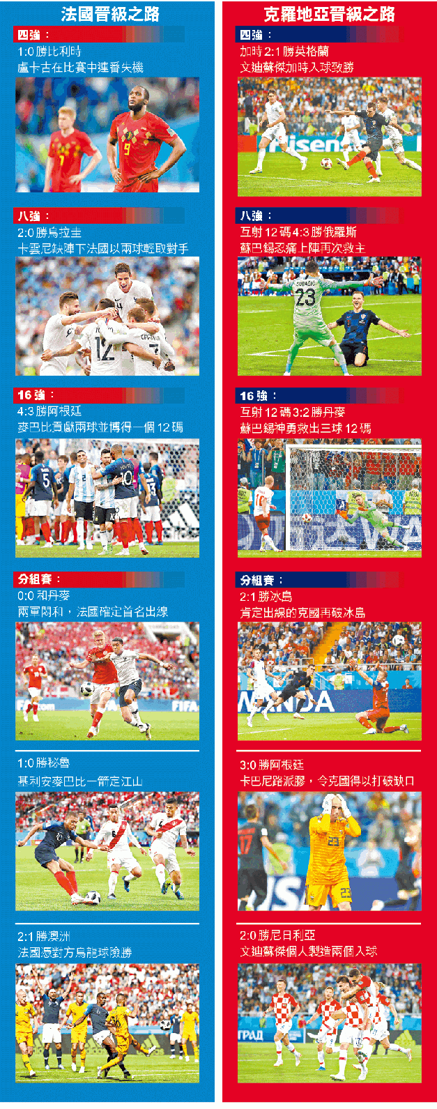 今屆世盃已到最後階段,在德國、西班牙等傳統強隊表現不濟下,巴西亦在八強不敵比利時,最後由法國與克羅地亞爭冠軍。球迷可能會對英格蘭未能晉級感可惜,但英軍對克羅地亞早段領先,仍無法保住勝果,這反映球隊確實有不足。比利時在細節執行上還需改善,對法國一仗,盧卡古等攻擊手有足夠入球機會,但處理上可以更理想,所失一球其實是低級錯誤,前柱六碼點是必爭要點,但比利時竟然沒有在此佈防,這就是細節。