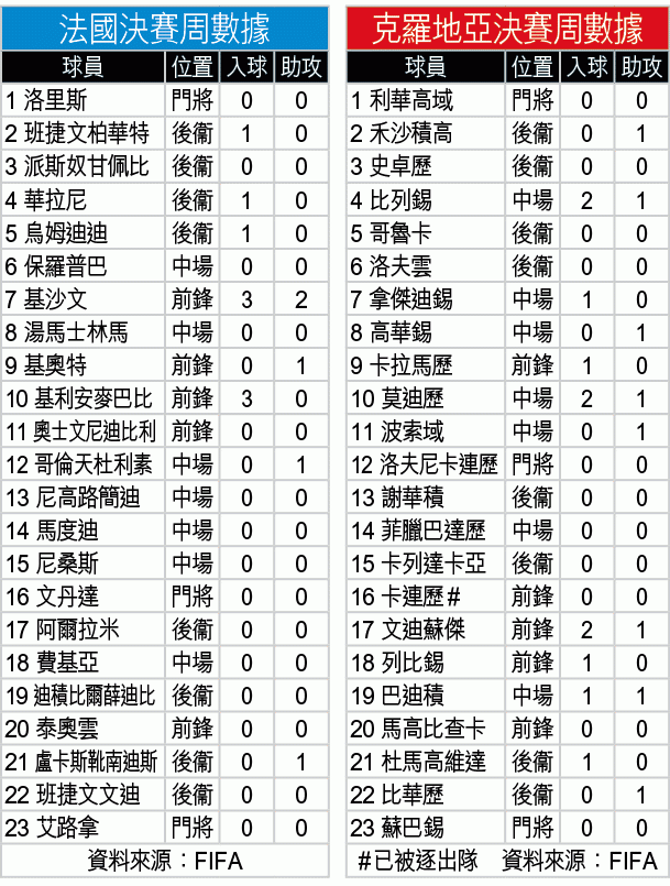 克羅地亞今屆能打入決賽,除戰意及實力,兩大中場莫迪歷與拿傑迪錫亦以表現證明為何近季可以在皇馬及巴塞成常規主力,兩人在今次賽事展示出級數,與擁有好中場在球隊的重要性。法克兩軍同樣擁有高質的中場線,臨場那隊能夠主導中場,將是這場決賽的其中一個勝負關鍵。