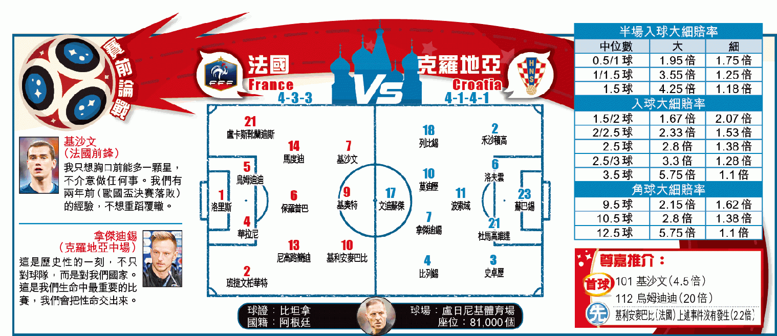 牌面上,法國在這場決賽肯定是秤先的一隊,而球員賽前特別提出兩年前的歐國盃決賽主場負葡萄牙是輕敵所致,今次絕對不會因此失盃,但克羅地亞能夠闖入決賽,實力甚強,預期戰況會相當接近,法國小勝機會不低。