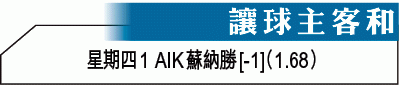 歐霸盃首圈外圍賽次回合,上周首回合作客也能取下1:0領先優勢的瑞超一哥AIK蘇納,周五主場再戰愛爾蘭球隊沙姆洛克流浪,有望憑質素較高的優勢再下一城,「讓球主客和」[-1]捧「主勝」。