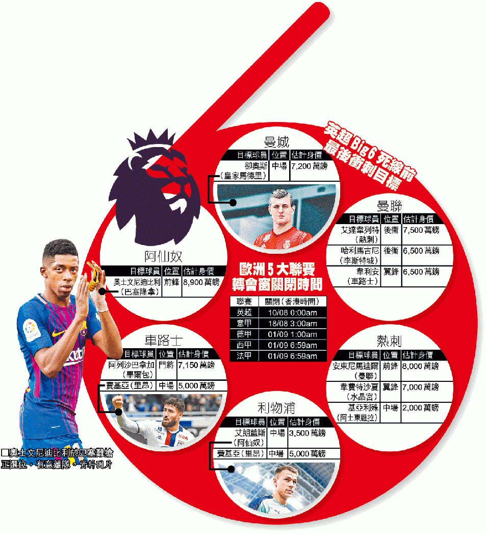 除曼聯外,英超Big 6中於轉會市場比曼聯更沉寂的是熱刺,普捷天奴希望能夠趕及簽下進攻球員,分擔哈利卡尼的壓力。今夏使費最大的利物浦,以及捲土重來的阿仙奴,組軍情況則已七七八八;前者或會爭取再添一名中場,兵工廠目標之一傳是在巴塞未能搶得主力位置的奧士文尼迪比利。至於衞冕的曼城簽下馬列斯之後,主帥哥迪奧拿表示只需要多一名防守中場便足夠。