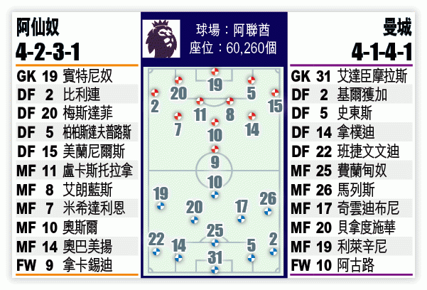 英超首輪最矚目戲碼周日爆發,衞冕之師曼城作客換帥的阿仙奴;曼城擴軍雖未算積極,但本身班底極雄厚,默契不用懷疑,無懼再訪倫敦,信「藍月」新季旗開得勝,讓半/一捧上盤。