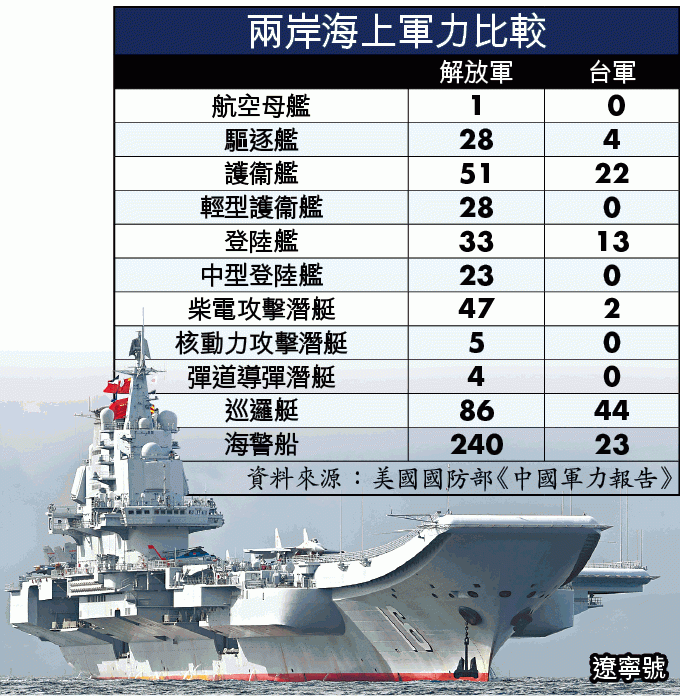 值得一提的是,台灣總統蔡英文提出打造戰力強大的「新海軍」,但兩岸海軍能力仍懸殊。報告提到兩岸海軍軍力比較,大陸海軍包括航空母艦等戰艦總數為546艘,台軍僅108艘,亦沒有航母及核動力攻擊潛艇。報告指,一旦爆發台海衝突,解放軍要以東部戰區、南部戰區參與作戰,有可能派出海岸警衞隊支援部隊。