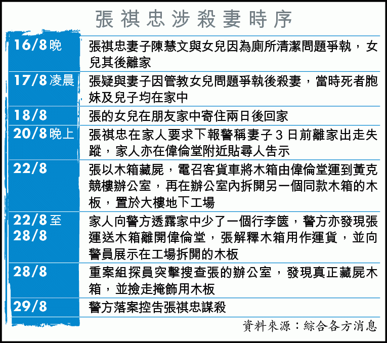 【本報訊】香港大學校務委員會委員兼機械工程學系副教授張祺忠涉嫌殺妻案,警方昨晚落案控告張祺忠一項謀殺罪名,今日提堂。消息稱,有人在家殺妻後,疑為掩飾行李篋藏屍木箱運往黃克競樓辦公室的行蹤,製造另一個同款木箱放在黃克競樓的工場內,向警方聲稱木箱只是用來運載物件。但天網恢恢,港島總區重案組追查發現有人曾購買12塊可製作兩個木箱的木板,以及張家一個行李篋離奇失蹤,最後查獲藏屍木箱。