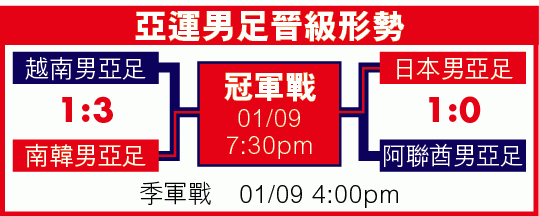 【足球】周三上演的亞運男子足球四強賽,南韓憑李昇佑梅開二度,以3:1輕取越南入決賽,意味在比賽中獻出一球助攻的熱刺球星孫興民,只差一步便可確定不用服兵役。