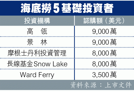 是次海底撈上市發行4.245億股,籌最多75.6億元,9%公開發售,海底撈5名基礎投資者名單合共認購3.75億美元(約30億港元),佔集資額四成,當中包括高瓴(9,000萬美元)、景林(9,000萬美元)、摩根士丹利投資管理(8,000萬美元)、長線基金Snow Lake(8,000萬美元),以及Ward Ferry(3,500萬美元)。海底撈上市保薦人為高盛及招銀國際,另加上中金、花旗及大華繼顯共5間投行包銷,瓜分2%或1.5億元佣金。