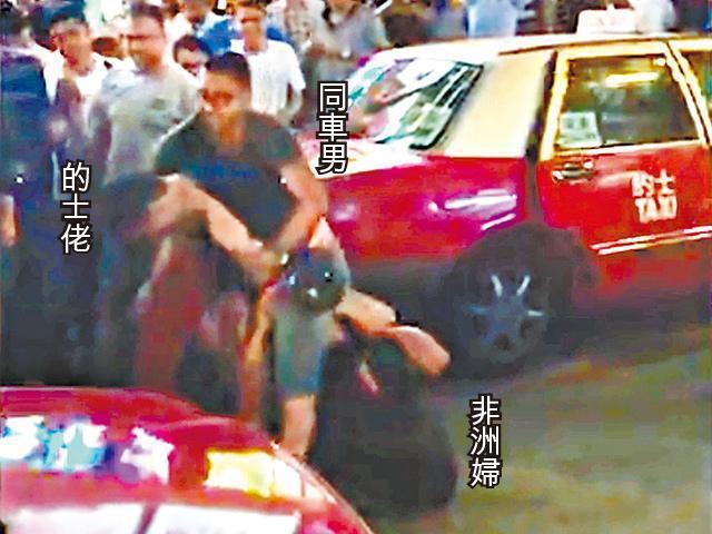 話說巿民陳先生前晚8點幾行過重慶大廈對開彌敦道,見到成班人喺度圍觀,好奇行入去睇吓,見到一個身穿黑衫嘅的士佬,同一位非洲婦互相拉扯,雙雙跌落地變成滾地葫蘆,陳先生見機不可失,即刻拎手機拍低呢場激戰。從陳先生提供嘅影片所見,非洲婦發晒爛渣,不斷扯住的士佬件衫起勢拖,搞到的士佬件衫爛咗大半截變咗香艷露肩裝。