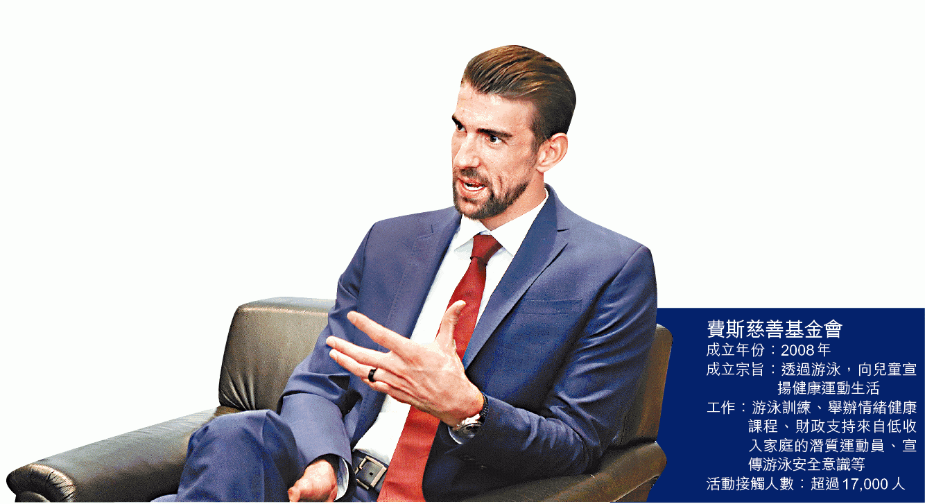 擁有28面奧運獎牌的費斯和姚明於香港會議展覽中心同場分享,就「運動改善都市人的身心健康及促進社會效益」各抒己見。費斯退役後投入公益活動,現為名下慈善基金會(Michael Phelps Foundation)總裁,其基金會旨在透過游泳,協助低收入家庭和有特殊教育需要的小朋友。