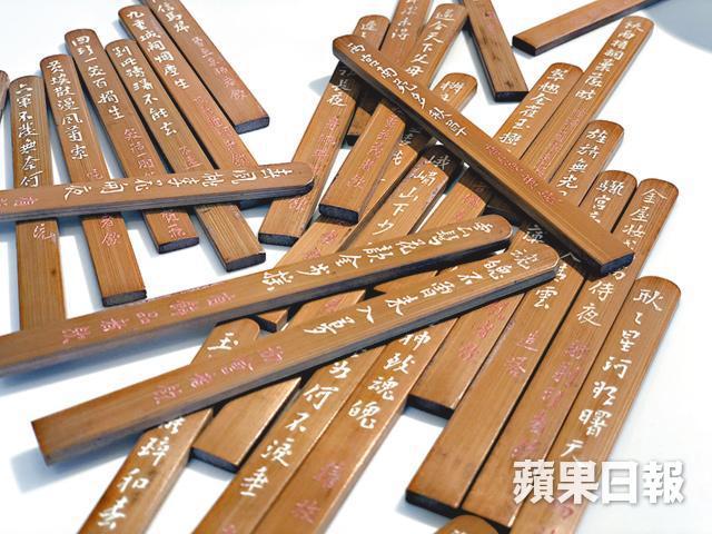 眼前這個像求籤的竹籤筒,內藏幾十支用竹削成的籌,每支都寫上《長恨歌》的詩句,下面就是一些指令,抽到甚麼就要按籌行事。例如:「西宮南苑多秋草」詩句之下的酒令是「有鬚者飲」;「魂魄不曾來入夢」詩句配上的酒令則是「初會者飲」;搞笑的有「貌美者飲」,林雪抽到都即刻乾杯啦!