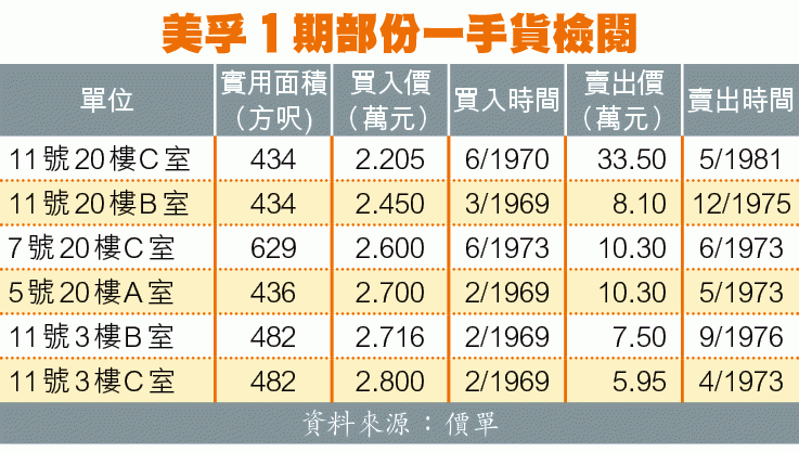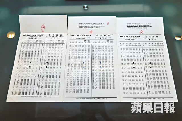 在測量師行普縉集團企業協助下,美孚新邨當年第一手價單(圖)重見天日,應可列為樓市「出土文物」。美孚新邨第1期早於60年代尾發售,疑似首張價單頁面寫上1968年8月,只有一頁紙,涉逾600個單位,分佈百老匯街1至11號(沒有10號)共10幢物業,售價低至2.45萬元起,即使是逾千呎「凸海」單位售價也不足10萬元,呎價數十元。最平單位為11號頂層電梯不到的20樓C室,實用面積434方呎,定價2.45萬元,呎價56元,料為美孚新邨歷來最平價單位。