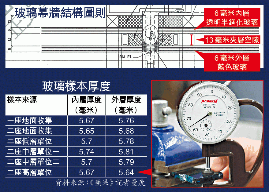 翻查當年的圖則,幕牆設計是由兩層玻璃組成的隔熱玻璃,外層是一塊6毫米厚的藍色玻璃,內層是另一塊6毫米的透明玻璃,兩層之間有13毫米的空位。測量師學會前會長何鉅業指,空位主要用作隔熱及隔音,實際強度就只是6毫米玻璃厚,「如果出面嗰層爛咗,入面嗰層都好大機會跟住爛」。